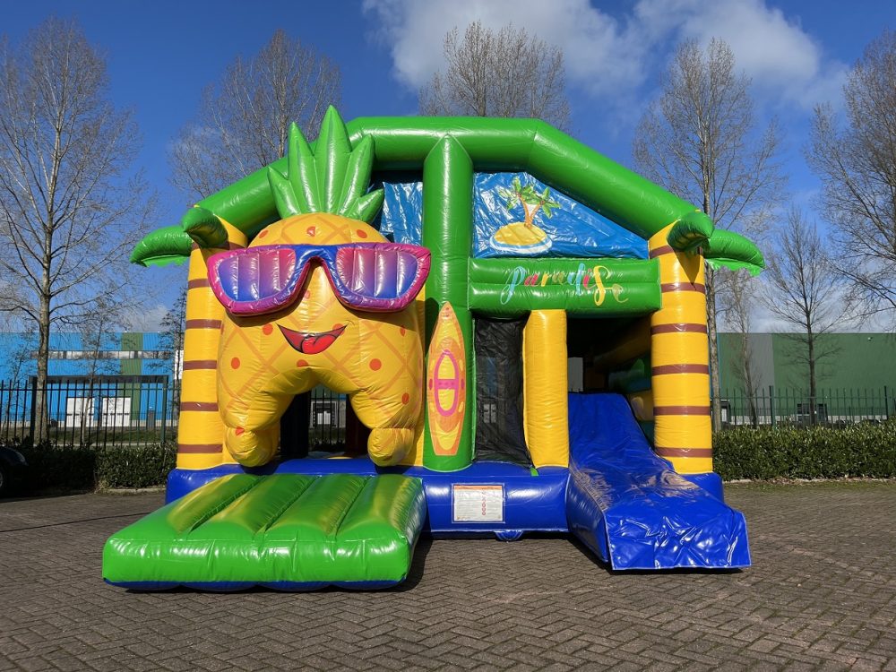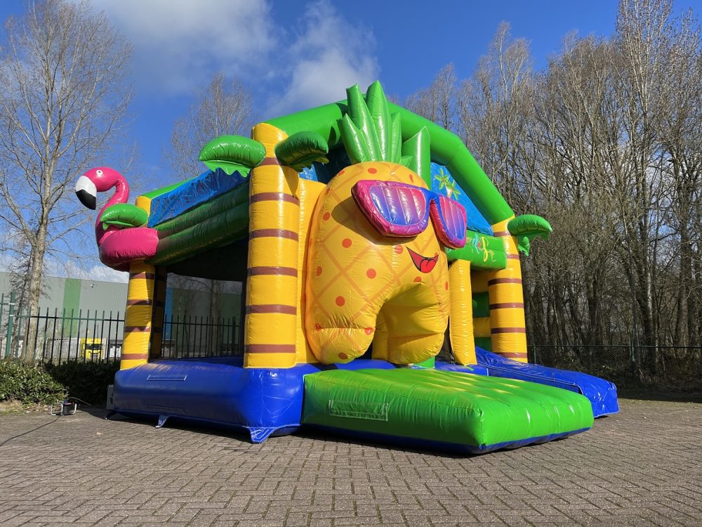 Een prachtig springkussen multiplay Paradise overdekt. U hoeft niet bang te zijn voor regen of zonneschijn want daar is het dak voor. Doordat het springkussen overdekt is, is het luchtkussen altijd in te zetten.  Naast het feit dat het dak voor regen en zonneschijn beschermd, is het ook een extra veiligheidsaspect. Tevens zijn er spannende obstakels voor de kinderen aanwezig. Deze obstakels zorgen ervoor dat de kids zich eindeloos kunnen vermaken. Daarnaast kunnen kinderen via de glijbaan weer naar buiten glijden. Hierdoor zullen uw kleine gasten zich altijd vermaken! Dus, koop uw springkussen nu bij Jump Factory!