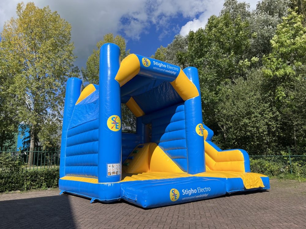 Compleet naar eigen wens van onze klant hebben we dit springkussen mogen produceren in de huisstijl kleuren van het bedrijf Stigho Electro. Het springkussen betreft een Multifun model met een springgedeelte en een glijbaan. Verder hebben we de logo’s en slogans van het bedrijf zichtbaar geprint op beiden pilaren, entree bovenkant en bij de opstap.